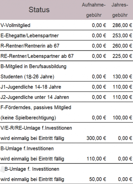 In begründeten Fällen kann eine ruhende Mitgliedschaft beim Vorstand beantragt werden. Diese beträgt für Erwachsene 50 Euro, für Kinder und Jugendliche 25 Euro pro Jahr. Ruhende Mitglieder haben keine Spielberechtigung.